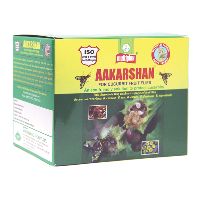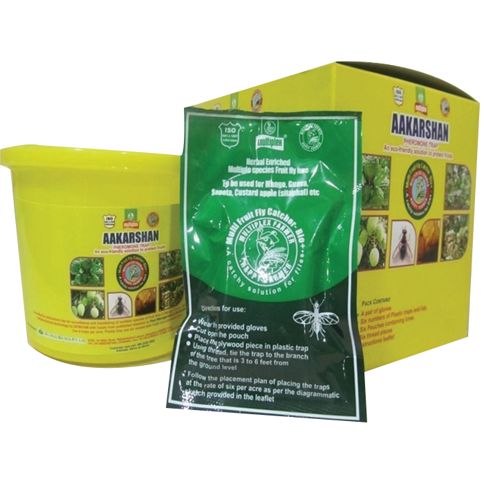 Multiplex Aakarshan (6 traps for an acre) – A slow release and rain fast trap for fruit fly which attacks majorly mango, guava, custard apple, plums, etc.